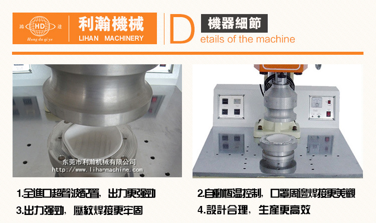 “鴻達”牌超聲波單工位口罩焊接機,是,依據不同客戶需求移風易俗的一款專用設備,本機操作靈活, 可合適不同型體的口罩進行周邊焊接(特別是出產高級口罩帶內膜EVA/熔布更快捷),選用超聲波焊接縫合的原理, 加裝恒溫 操控儀, 保證口罩周邊 焊接結實,圖畫明晰.