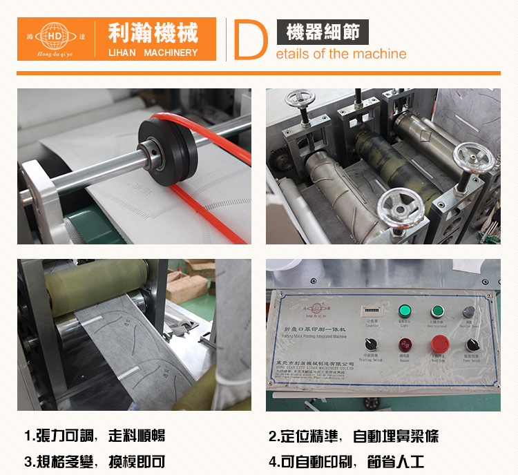 “鴻達”牌口罩印刷一體機,是利瀚企業依據折疊口罩特色,移風易俗的一款集印刷、鼻梁條、打孔于一體的新式折疊口罩設備, 本機自動化程度高, 口罩出產功率較高,切邊周圍巨細均勻,鼻梁條出位距中且不傷料,然后有用的保證了出產出的口罩質量。