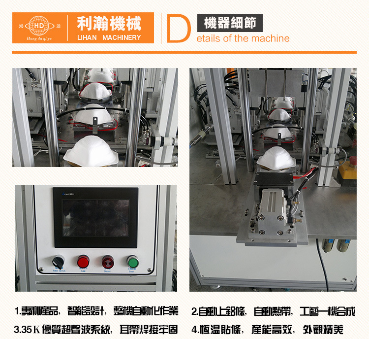 該機(jī)是利瀚公司針對防塵口罩而精心研發(fā)杯型口罩自動化上帶的配套設(shè)備,該設(shè)備自動化程度較高, 將傳統(tǒng)比較冗雜的口罩出產(chǎn)工藝進(jìn)行技能革新,實(shí)現(xiàn)從口罩鼻梁條焊接、耳帶焊接一次完結(jié),然后大大的提高質(zhì)量與產(chǎn)能。