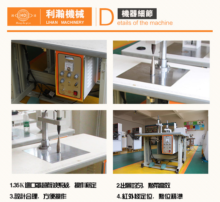 “鴻達”牌口罩耳帶點焊機,是依據口罩特色而規劃的一款點焊耳帶的專用設備, 本機操作靈活, 選用進口高頻率超聲波進行焊接,有用的戰勝傳統點焊之后呈現的斷帶、焊接不牢等問題,加配紅外線定位設備,保證耳帶焊接定位精準。