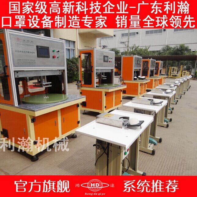 內耳帶焊接機(HD-LHKZJ10):超聲波內耳帶口罩機用超聲波焊接方法,當口罩移至加工的方位時,超聲波主動發生,在耳帶上構成微振幅高頻率的振蕩, 并瞬間轉化為熱量,熔融所要加工的資料,最終使耳帶永久性的張貼或埋植在口罩本體內側,是內耳帶口罩出產最終一道加工工序,僅需一名操作員將口罩本體一片片置放于 口罩盤內,后續動作至制品完結由設備主動操作。