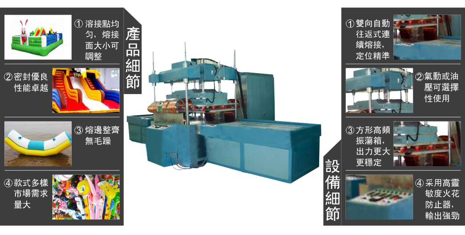 1、 PVC雙面吸塑封口,PVC或PVC含量在10%以上之軟硬膠熔接;高Q值電子振蕩管,輸出穩定可靠 •高靈敏度火花抑制,電路防止損壞模具 •推盤式結構,有效提高生產效率 •氣缸頂出定位裝置,定位準確 •優質進口元器件組裝 2、兩邊滑板推動,位置準確靈活;NL-5557防火花電子管保護裝置;雙置電箱分體裝置,易于散熱維修。 3、本機裝有特殊電子回路,能自動切斷高周波壓制火花,使磨具和物料的損害降到最低 4、技術參數: