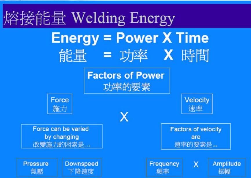 超聲波熔接裝置是通過一個電晶體功能設備將當前50/60Hz的電頻轉變成20KHz或40KHz的電能高頻電能,供應給轉換器。轉換器將電能轉換成用于超聲波的機械振動能,調壓裝置負責傳輸轉變后的機械能至超聲波熔接機的焊頭。焊頭是將機械振動能直接傳輸至需壓合產品的一種聲學裝置??! 振動通過焊接工作件傳給粘合面振動磨擦產生熱能使塑膠熔化, 振動會在熔融狀態物質到達其介面時停止,短暫保持壓力可以使熔化物在粘合面固化時產生個強分子鍵, 整個周期通常是不到一秒種便完成,但是其焊接強度卻接近是一塊連著的材料。 如下圖所示,振動能量從焊頭傳遞到工件,工件之間的摩擦產生的熱量將工件熔接面熔化,從而焊接成一體。