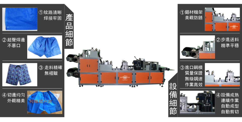 利瀚企業自*主*研*發的超聲波沙灘褲機,采用超音波熔合技術,從原材料送入到成形切斷至成品輸出,全制程自動化且產量極高。具有產能高(每分鐘10條左右),性能穩定,一臺機器可任意變換模具等眾*多特點: