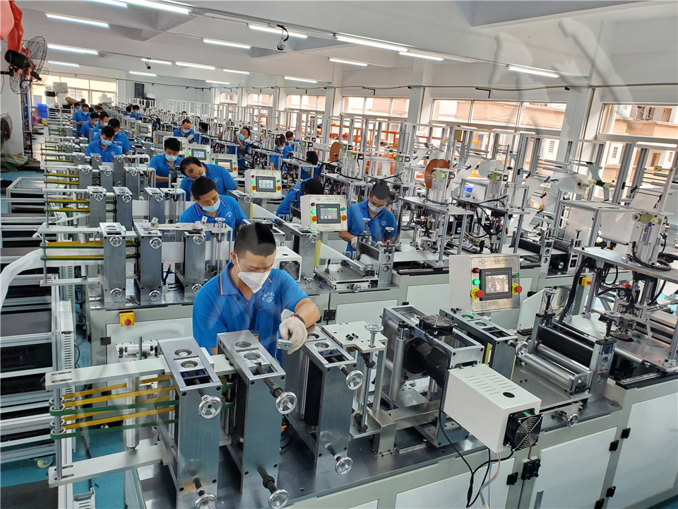 9.整條生產線由2個人操作,一個人負責看機運轉以及更換原材料卷料;一個人負責收集成品口罩有序排列裝箱;負責看機的人可以同時兼顧多臺機器。